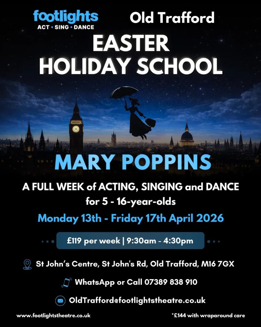 Footlights Old Trafford theatre company will be offering holiday school for 5 -16-year-olds at St John’s Centre this Easter from 13th -17th April – a full week of drama, dance and music based on Mary Poppins.